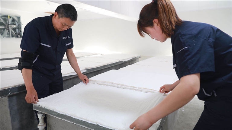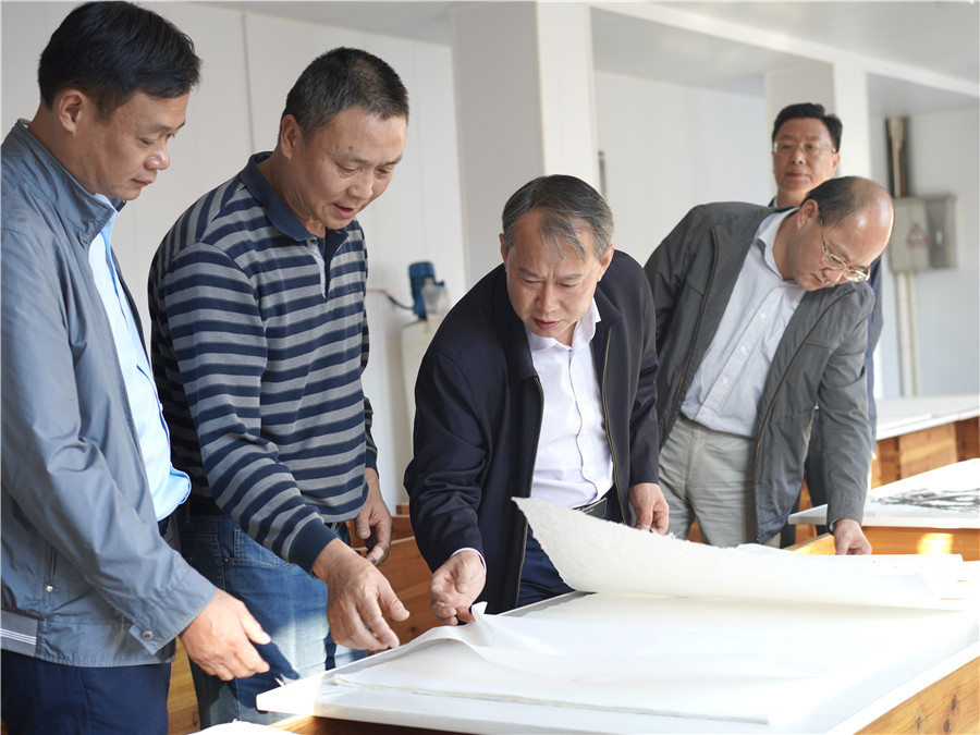 10月9日下午,縣長(zhǎng)吳云忠赴海陽(yáng)鎮(zhèn)凝霜文化發(fā)展公司調(diào)研徽州楮皮紙傳承與發(fā)展工作,縣委常委、海陽(yáng)鎮(zhèn)黨委書(shū)記金學(xué)年,縣委常委、縣政府副縣長(zhǎng)程衛(wèi)華參加調(diào)研活動(dòng)。 吳云忠一行實(shí)地察看了徽州楮皮紙生產(chǎn)工藝流程,認(rèn)真聽(tīng)取企業(yè)負(fù)責(zé)人介紹,詳細(xì)詢問(wèn)徽州楮皮紙制作工藝